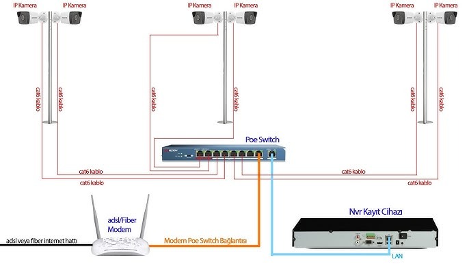 IP kameralar genellikle Ethernet kablosu veya Wi-Fi ile ağa bağlanır. Kurulum sırasında: